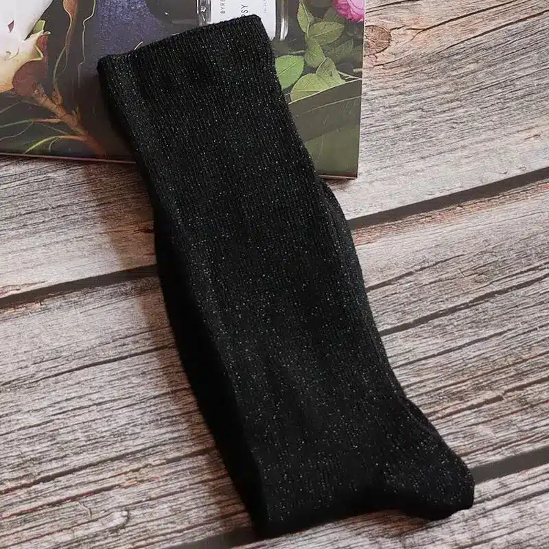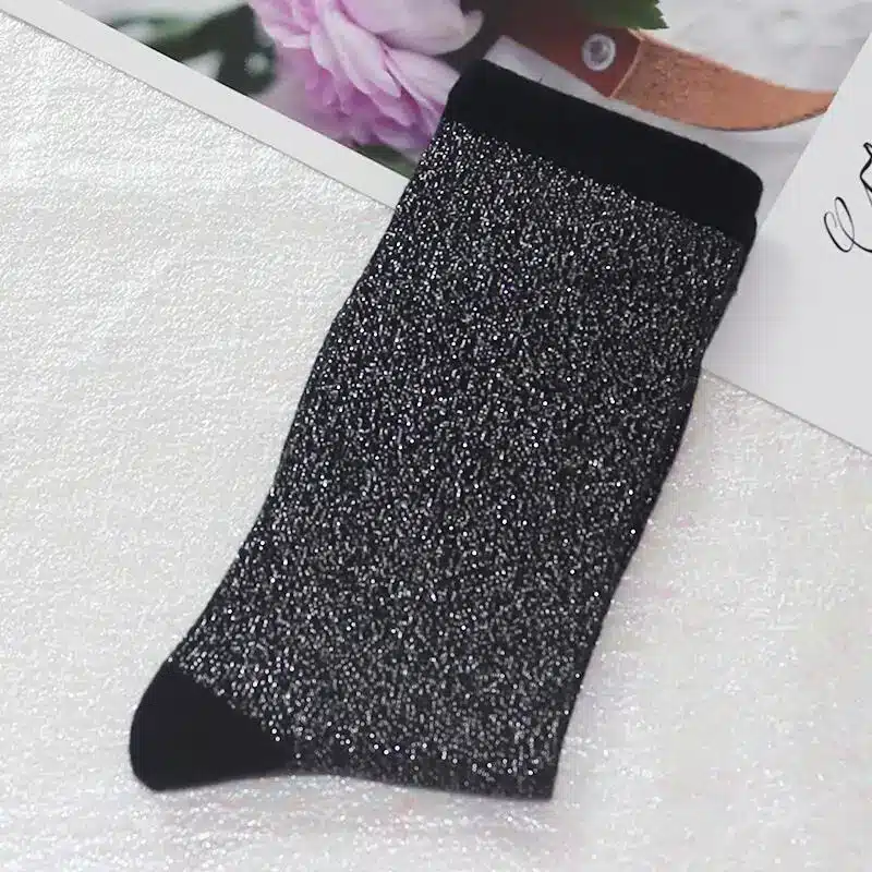 Les chaussettes à paillettes noires associent confort et style. Leur couleur neutre et élégante se marie avec tout, du jean décontracté à la robe de soirée. Les paillettes apportent une touche lumineuse discrète, parfaite pour celles qui aiment un détail simple mais qui se remarque.