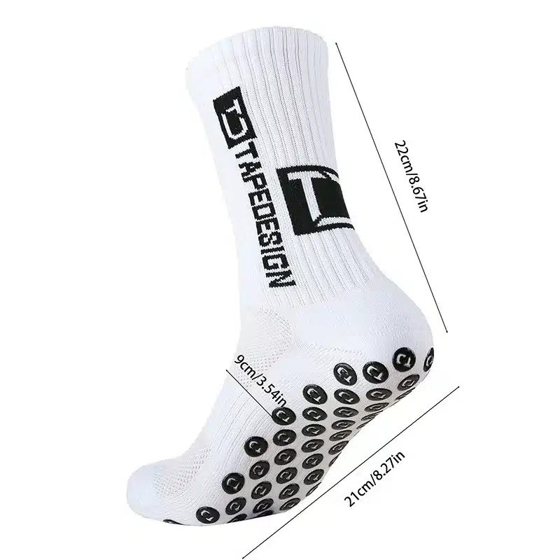La hauteur mi-mollet de ces chaussettes antidérapantes football offre une protection optimale qui remonte généreusement sur la jambe, rappelant les chaussettes techniques des joueurs professionnels. Le bord côtelé élastique se distingue par sa couleur contrastante qui crée une démarcation nette et sportive.