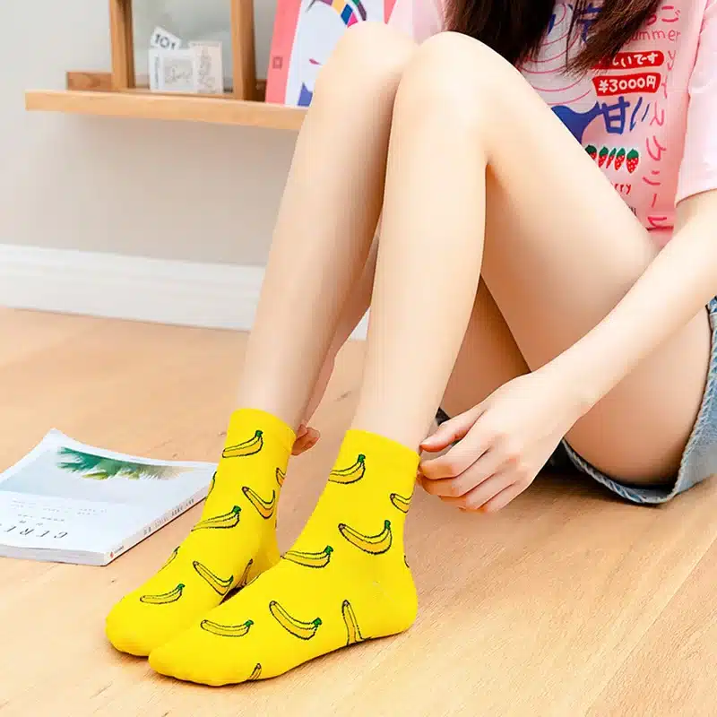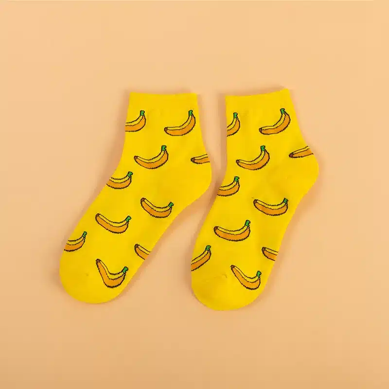 Ces chaussettes banane affichent un motif tropical éclatant sur un fond jaune vif qui évoque instantanément la couleur naturelle du fruit.