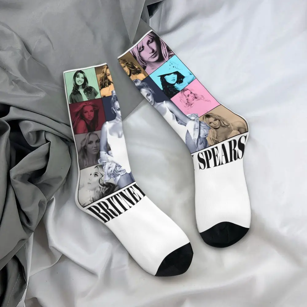 Ces chaussettes Britney Spears transforment vos pieds en véritable hommage à la pop culture des années 2000, avec un patchwork coloré qui mélange portraits de la star, logos iconiques et visuels d’époque.