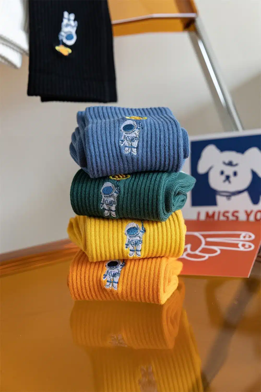 Présentées dans une palette de couleurs variées, ces chaussettes mi-mollet déclinent l’univers spatial sur différentes teintes : orange vif, noir profond, vert sapin, bleu ciel et blanc immaculé, chacune ornée de son petit astronaute brodé avec un soin minutieux.