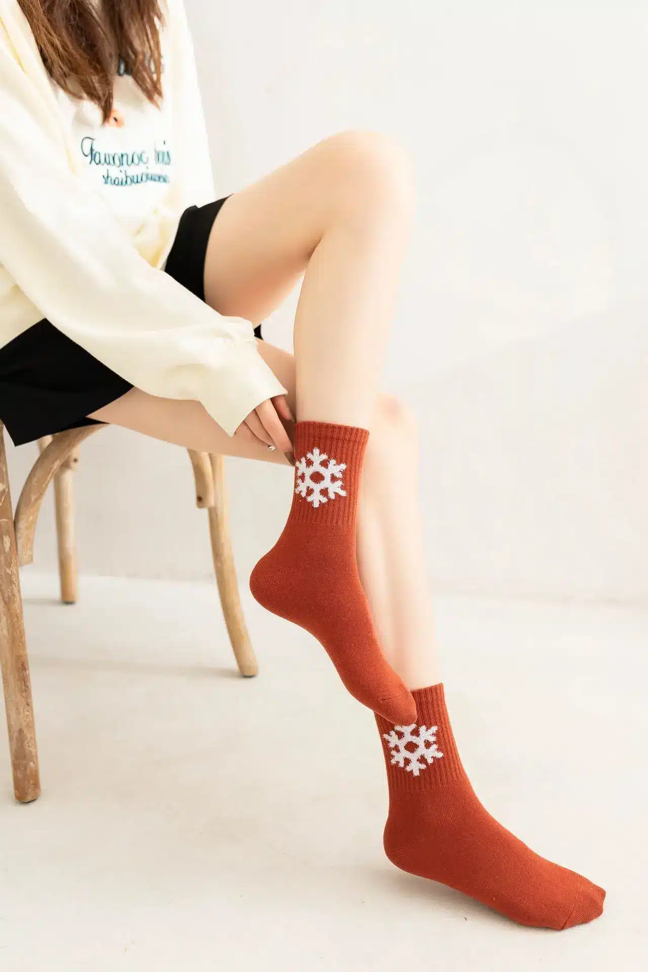 Chaque chaussette est ornée d’un flocon de neige blanc parfaitement centré sur le devant, créant un contraste saisissant qui capture immédiatement le regard.