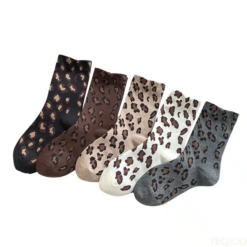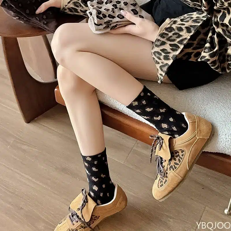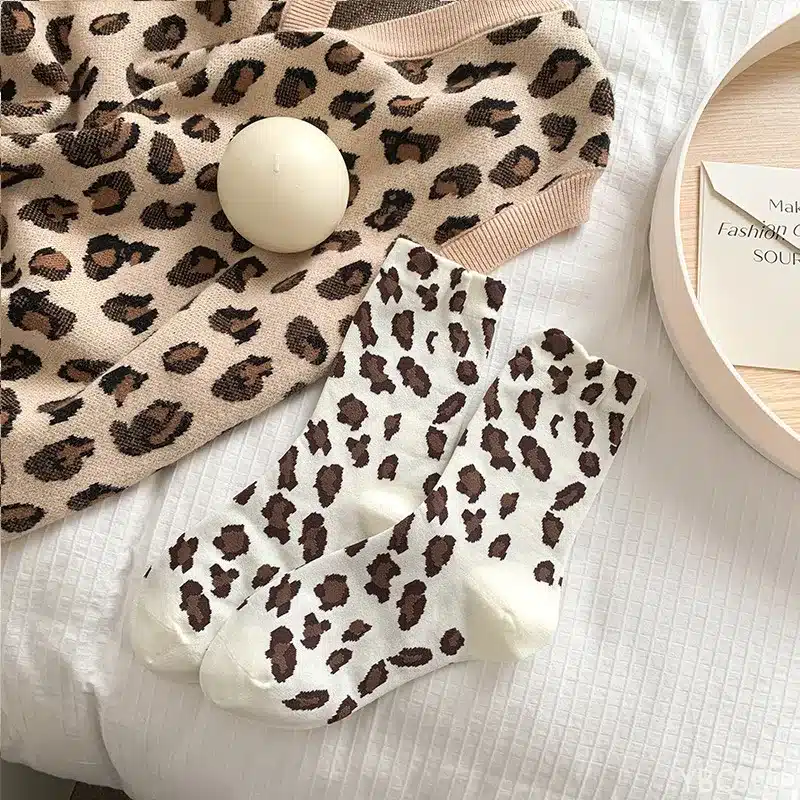 Ces chaussettes léopard se glissent avec panache dans des bottines en cuir noir pour un look rock chic, ou contrastent délicieusement avec des baskets blanches minimalistes.