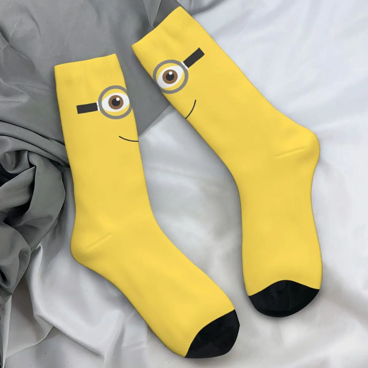 Chaque chaussette présente un motif minimaliste et expressif : un œil unique cerclé de noir avec sa pupille malicieuse, accompagné d’un sourire discret qui évoque instantanément l’univers espiègle des Minions.