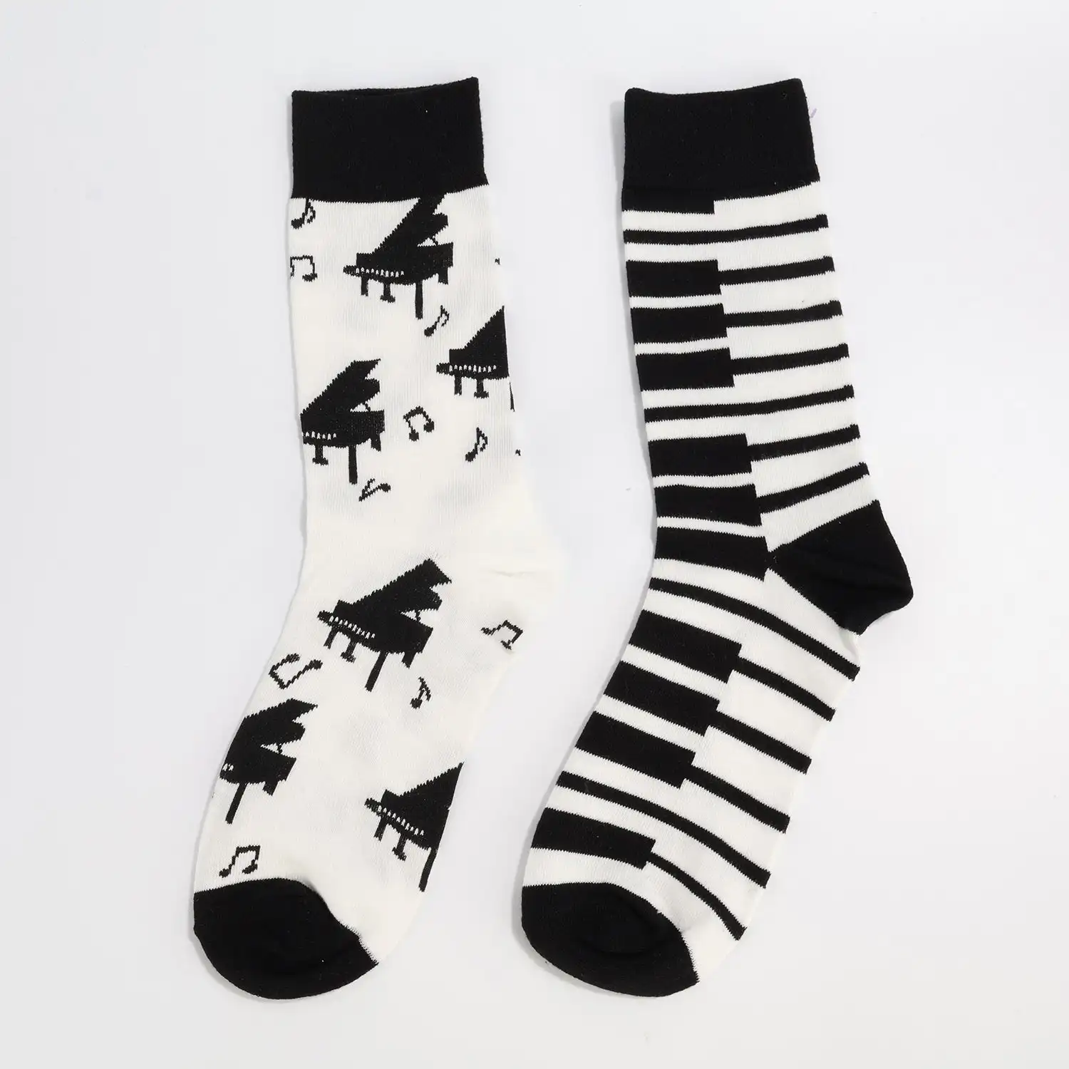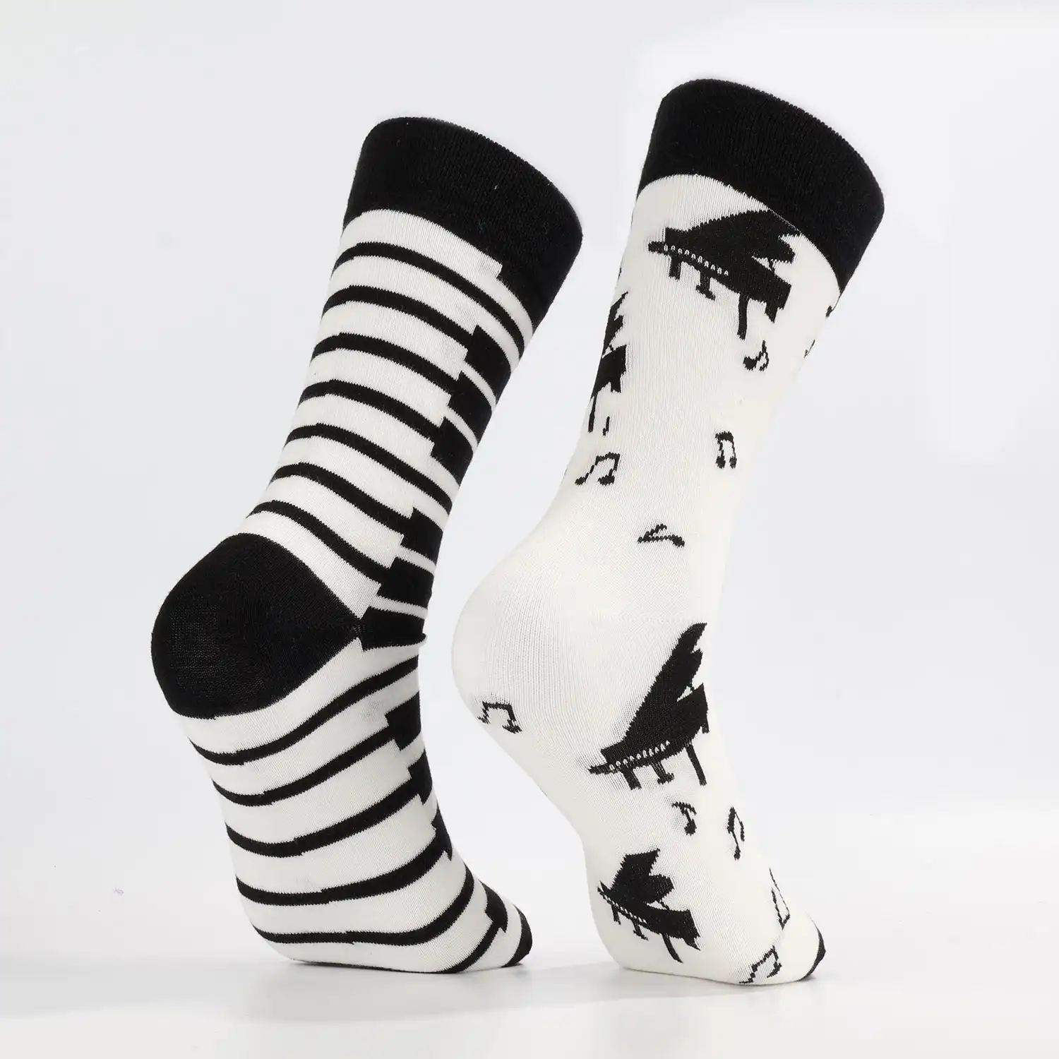 Ces chaussettes mi-mollet remontent généreusement sur la jambe, offrant une belle surface d’expression pour leurs motifs musicaux. Le tissu apparaît doux et souple, avec une texture lisse qui met parfaitement en valeur les détails graphiques de chaque design.