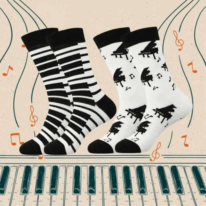 Ces chaussettes piano transforment vos pieds en véritables instruments de musique avec leurs motifs saisissants de réalisme. La première paire arbore un design touches de piano en noir et blanc, reproduisant fidèlement les touches d’un clavier avec leurs proportions parfaites et leur alternance caractéristique.