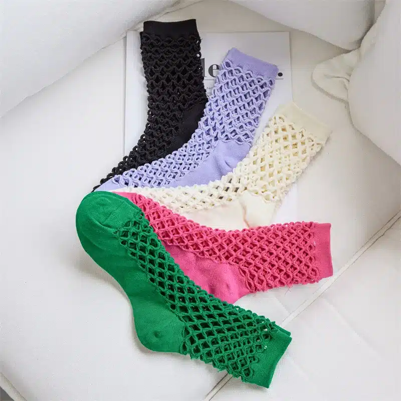 Ces chaussettes résilles dévoilent un motif ajouré sophistiqué qui transforme vos pieds en véritables œuvres d’art textile. Le motif résille forme un entrelacs géométrique régulier, créant des losanges parfaitement alignés qui laissent entrevoir délicatement la peau.