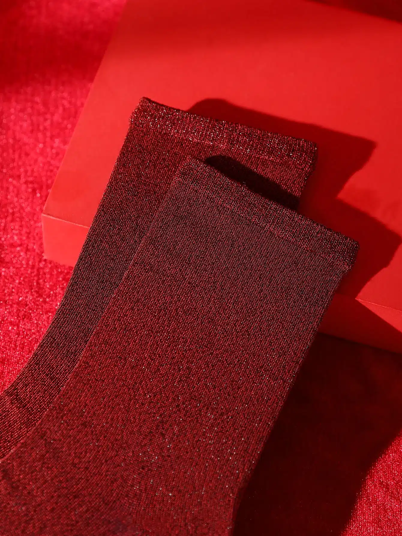 Le rouge bordeaux intense recouvre entièrement ces chaussettes mi-mollet, créant un effet monochrome élégant et romantique.