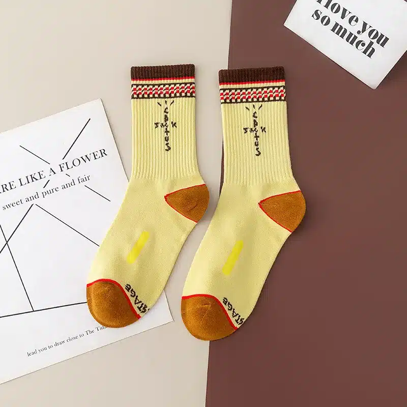 Les chaussettes mi-mollet arborent des motifs emblématiques qui racontent l’histoire de Travis Scott : des croix stylisées, des logos iconiques et des symboles mystérieux se dessinent sur le tissu avec une précision remarquable.
